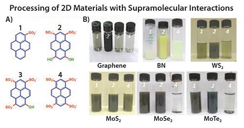 圖2. A) 用于超分子石墨剝離的四種芘衍生物化學式比較. B)使用芘衍生物生成的二維晶體分散光學圖像(編號1、2、3、4與(A)中展示的有機染料的磺酸基團標號對應)8,44