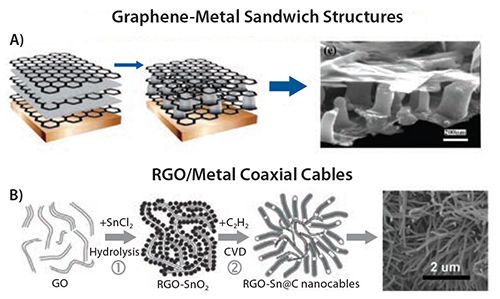 圖4. A) 石墨烯/Sn納米柱納米結構制備過程示意圖及相應的SEM圖像;B) 合成RGO支持的Sn/C納米線纜的過程示意圖及相應的SEM圖像。71