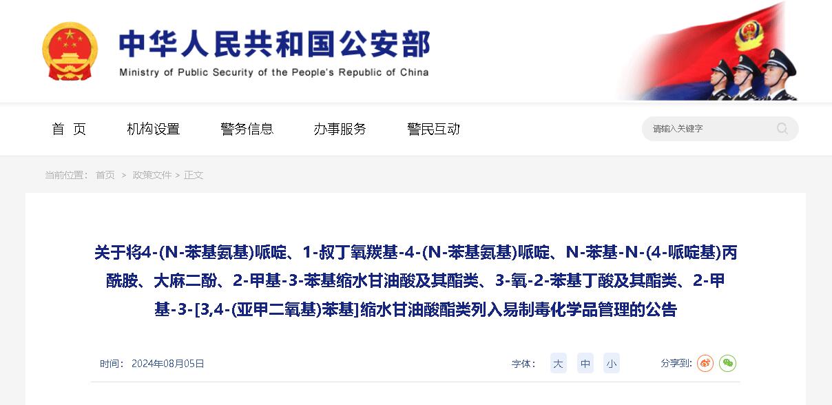 為加強易制毒化學品的管理,公安部、商務部、國家衛生健康委員會、應急管理部、海關總署、國家藥品監督管理局于2024年8月2日聯合發布公告,決定將4-(N-苯基氨基)哌啶等7種物質列入易制毒化學品管理。公告自2024年9月1日起施行。